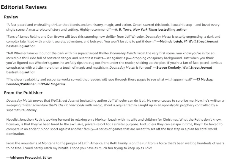 If you have such reviews, include them on your books’ pages. However, include not only the names of the reviewers but also their status and position, such as bestselling author or editor. If it’s a magazine or newspaper, include the title.